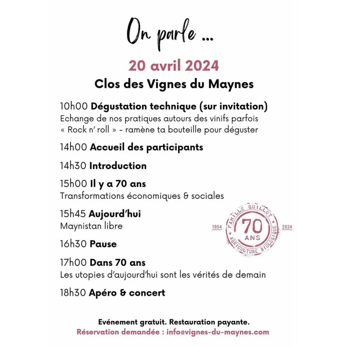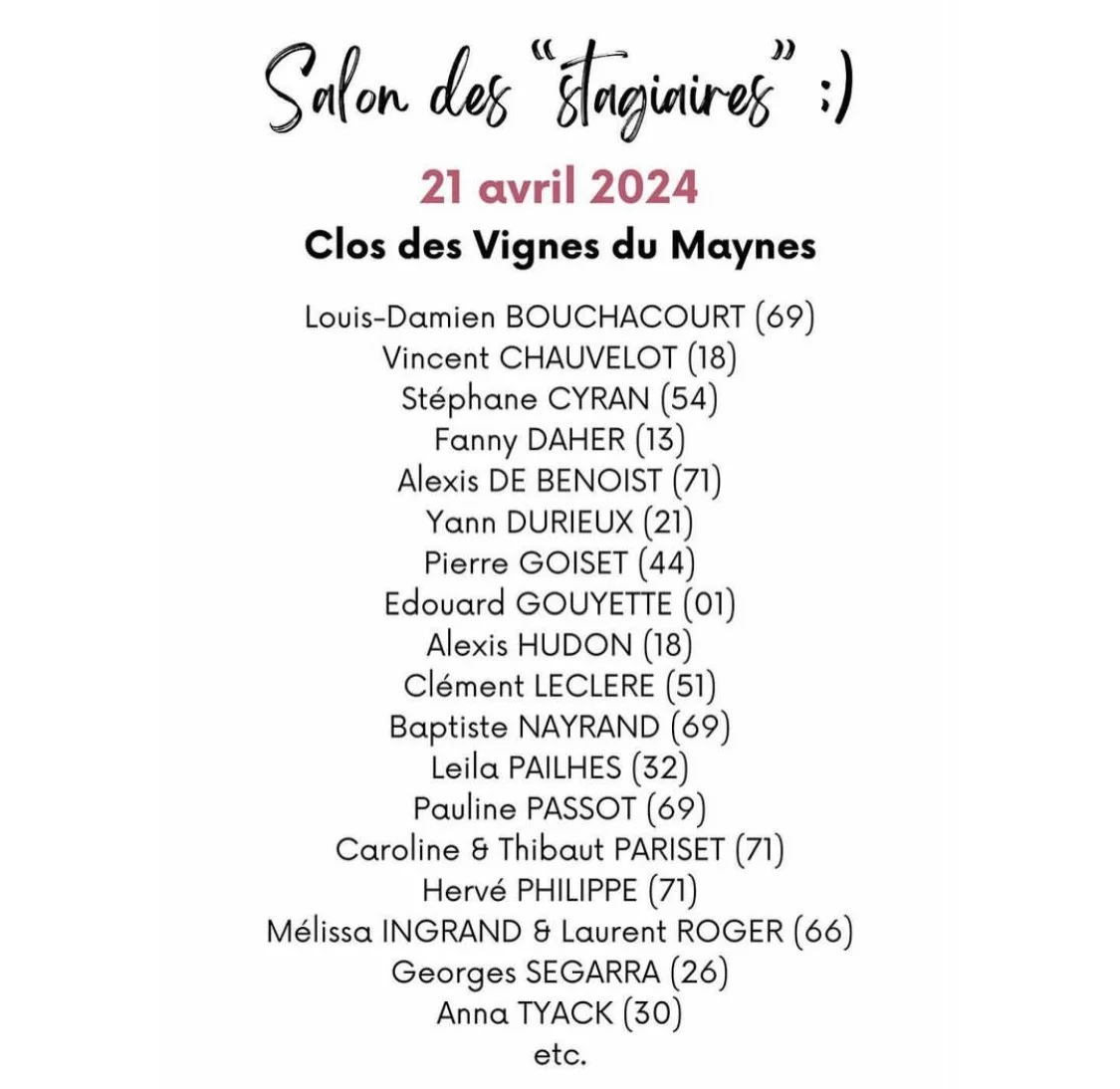 Salon Des Stagiaires Sunday 21 April 2024 10:00 18:20 429 Rue des Moines Cruzille, Bourgogne-Franche-Comté, 71260 France (map) Google Calendar ICS View fullsize View fullsize View fullsize