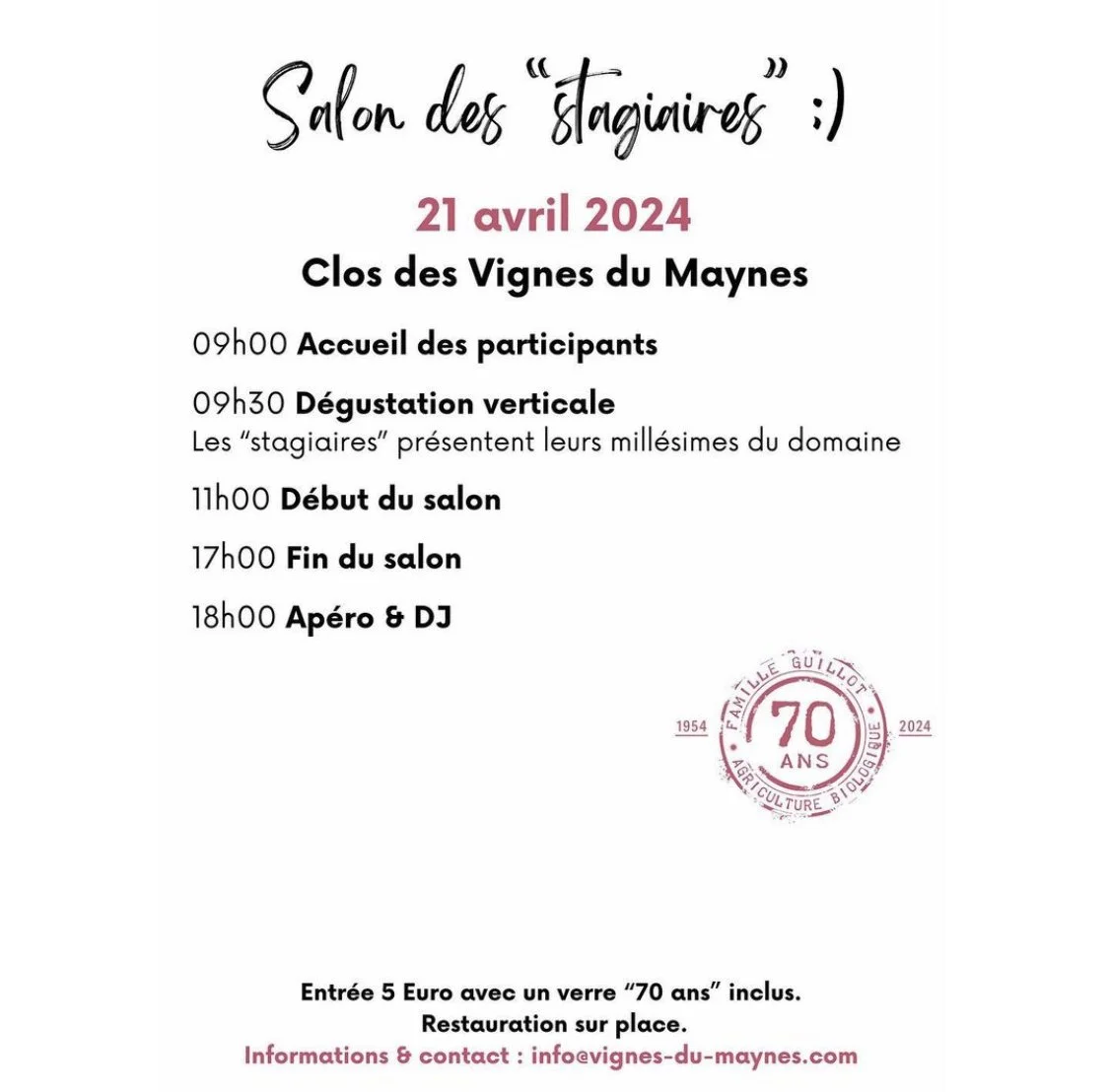 Back to All Events Salon Des Stagiaires Sunday 21 April 2024 10:00 18:20 429 Rue des Moines Cruzille, Bourgogne-Franche-Comté, 71260 France (map) Google Calendar ICS View fullsize View fullsize View fullsize